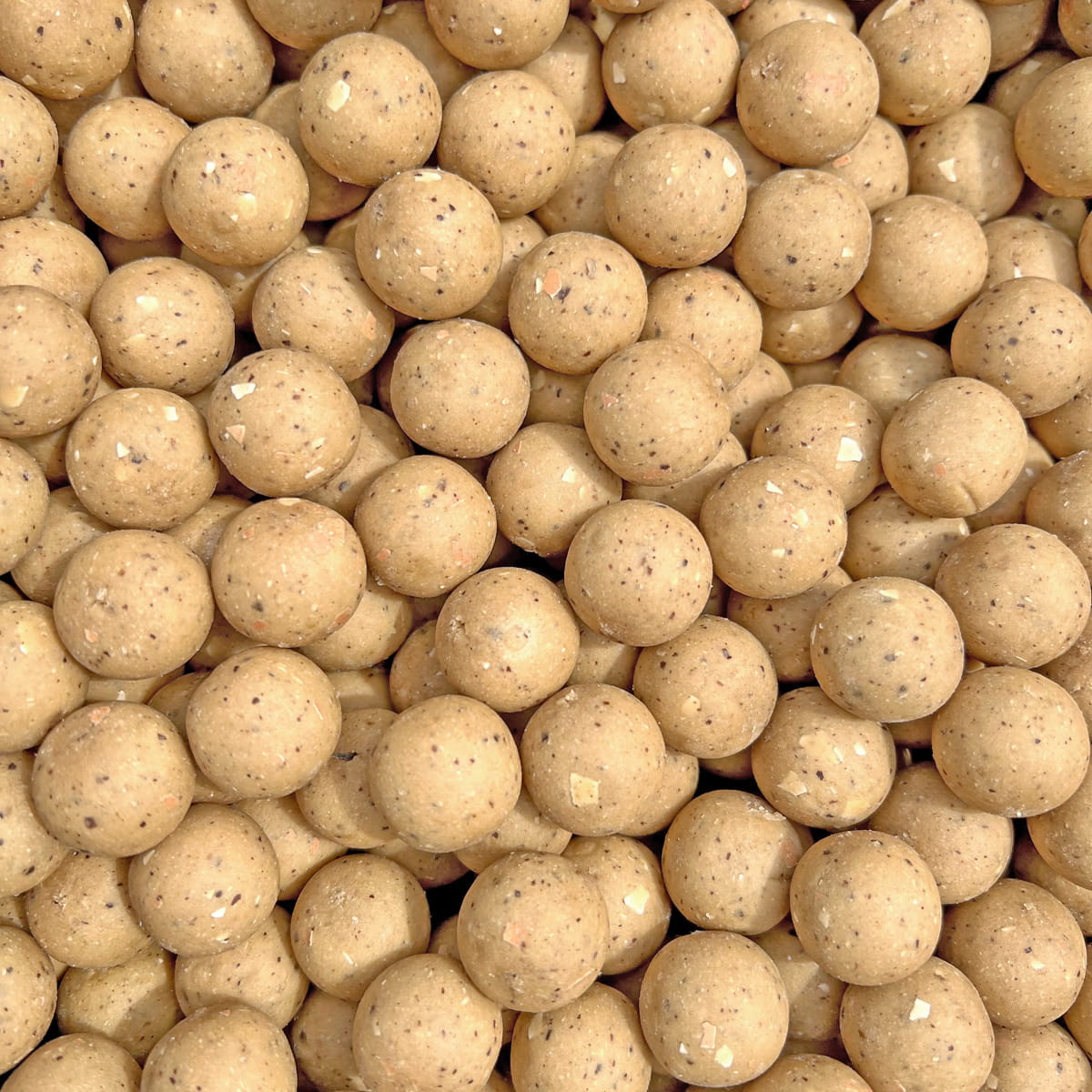 Die Boilies Mais Natur bestehen aus einer Mischung von 10 natürlichen, sorgfältig ausgewählten Zutaten. In ihrer Zusammensetzung findest du unter anderem hochwertige Mehle von geprüften Lieferanten (darunter eine große Menge Maismehl), Hanfschrot und gemahlene Bohnensamen. Um ein Kilogramm Proteinbälle herzustellen, verwenden wir bis zu 10 frische Eier. Zusätzlich fügen wir auf jedes Kilogramm Bälle 40 ml CSL hinzu, also eine leicht fermentierte flüssige Form von Maisstärke, was einen einzigartigen Duft und Geschmack garantiert, dem Karpfen nicht widerstehen können. Das Ganze ergänzen wir mit Aminosäuren wie Lysin und Betain, wodurch unsere Bälle eine nahrhafte Nahrung von höchster Qualität darstellen.
