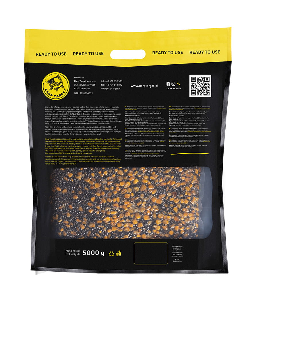Im Mais-Hanf-MIX befinden sich 50 % Mais und 50 % Hanf. Dies ist ein extrem universelles und effektives Lockfutter, das die gesamte Saison über für jede Art von Friedfischen funktioniert – insbesondere für Karpfen, Karauschen, Schleien, Brassen und Graskarpfen.